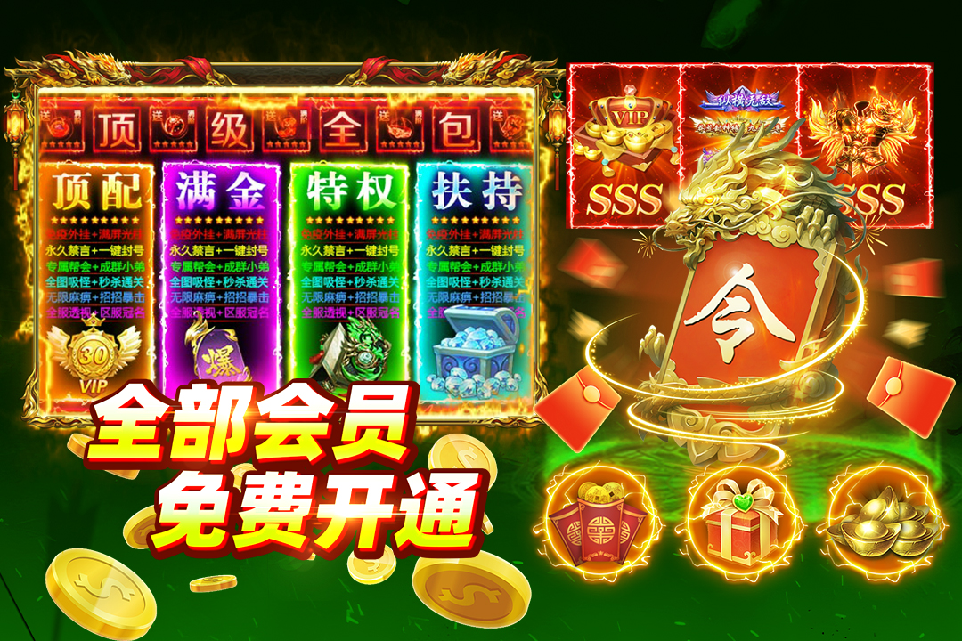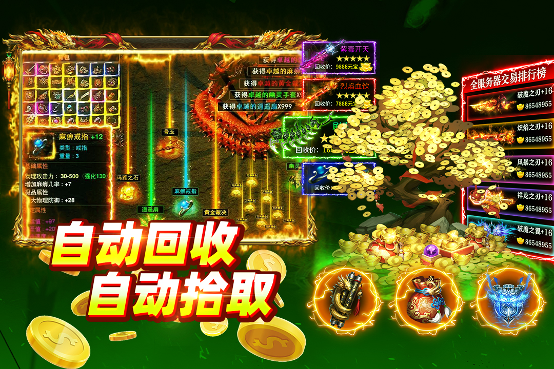 《大剑传奇》是一款原汁原味的复古传奇手游,完美还原经典“战法道”三职业。地下抢宝、激情乱斗、树妖降临、仙魔大战、热血攻沙等经典玩法一应俱全,更有远古战场、洪荒禁地、群雄逐鹿等重磅跨服战场,点燃无限激情! 游戏主打高爆率、装备靠打、自动回收、元宝持续产出,轻松挂机即可打宝赚收益,散人也能畅快逆袭!新服盛大开启,福利拉满 —— 自动回收、自动拾取、背包全开、会员免费开通,上线即享超爽体验! 游戏特色
