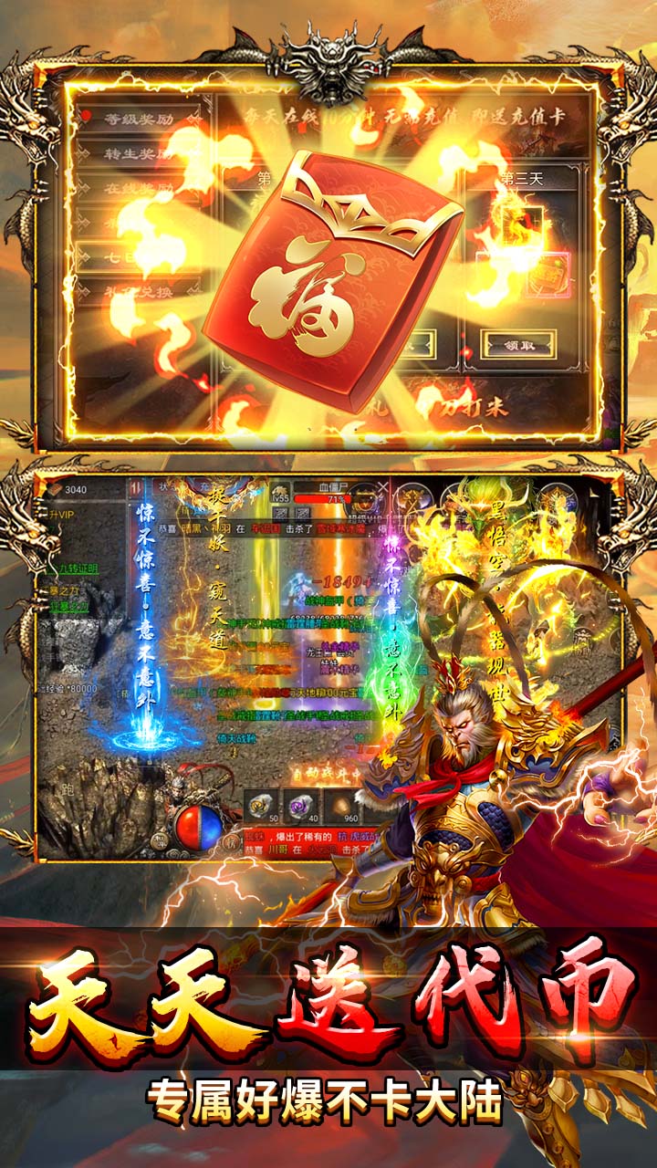 2.上线福利:创角即送齐天大圣限定时装,送首充、群体切割、自动回收,自动范围拾取