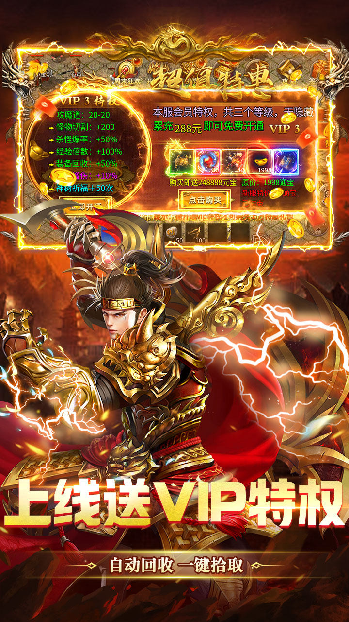 2.上线福利:上线送十年传奇称号,赞助VIP1、VIP2特权卡