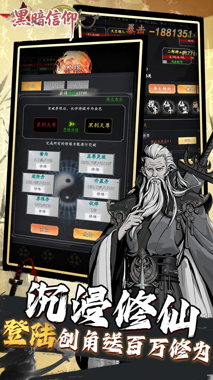 《黑暗信仰(0.05折买断版)》是一款文字修仙游戏,我欲成仙,渡劫飞升。全场0.05折!!开宗立派结识各路道友,沉浸式修仙,凡人逆天命。放置成长,完成任务即可领奖,每日登录惊喜不断,各种稀有材料,等你畅游修真界。在奇异修真世界,浩瀚星空,无尽苍穹,斩妖除魔,炼丹炼器,法宝神器等你都可以一一体验,构建千万修真小说迷修真梦,渡劫踏仙门,追逐修真长生之旅。