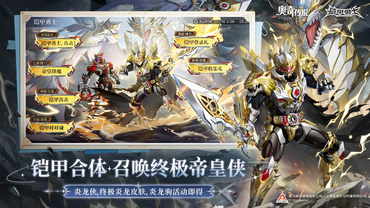 【铠甲勇士联动】参与联动系列活动,轻松得炎龙侠时装、炎龙侠皮肤、炎龙侠坐骑-炎龙驹、专属红星*2、炎龙侠满神器等超多好礼!