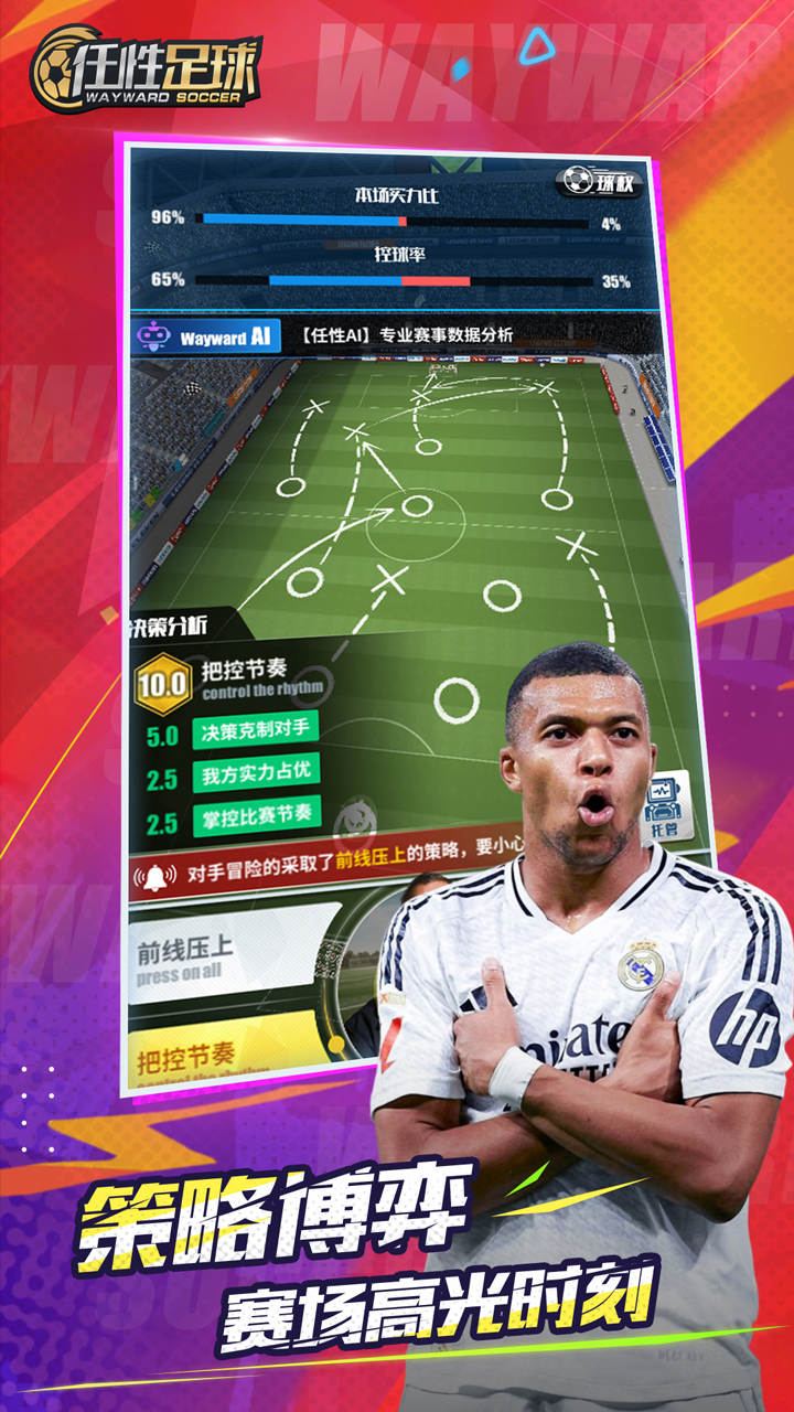 【FIFPro授权 世界超级球星纷至沓来】 游戏包含全世界各家俱乐部的当家球星,英超、西甲等六大阵营明星球员,解锁羁绊加成,为广大经理人提供丰富选择,收集海量巅峰球员,组建梦想的阵容,带领他们站上世界之巅吧。 【百种策略战术 临场指挥任我运筹帷幄】 赛前调整阵型,球员克制,球星技能,为比赛做好充分准备,赛中临场策略,确认球队攻防侧重,时时调整比赛中的战术策略,用细节击败对手,体验丰富的策略纵深。