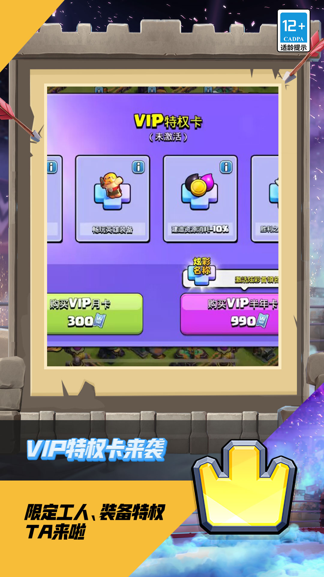 【新特权】VIP特权卡上线,限定工人、装备畅玩、建造消耗减免、胜利之星加成等专属特权,等你体验!