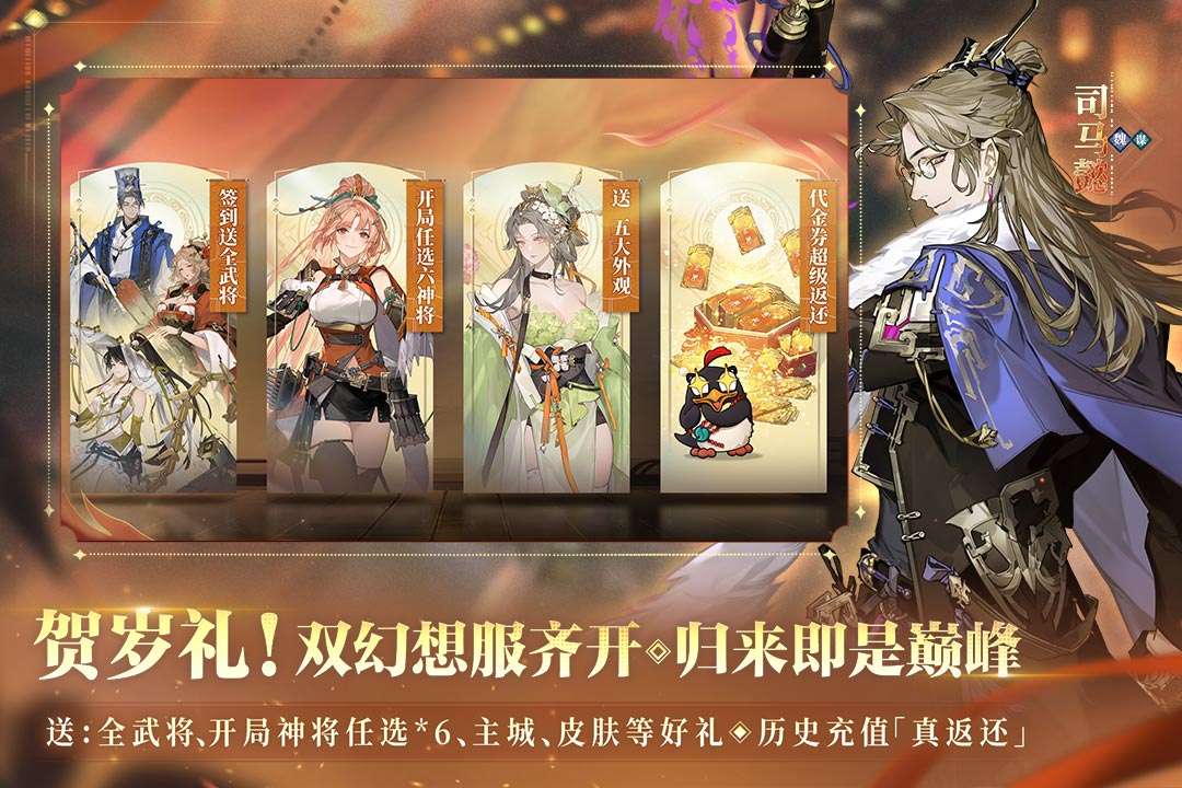 岁末年初,暖意盈庭!大型春节活动「幻度新春」暖心来袭,趣味玩法「璇玑藏瑞」同步开启,参与即可免费获取全新武将「姜维」,更有海量福利连番放送,诚意满满,不容错过。