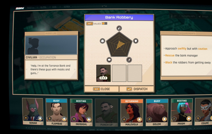 《超英派遣中心Dispatch》是一款超级英雄职场喜剧游戏,其中的故事发展将因你的选择而变化。你将管理一队由不合群的异类英雄所组成的功能失调团队,策略性地派遣不同的英雄到城市中各紧急事故现场处理事故,同时还要平衡办公室政治、人际关系,以及追寻你自己的英雄旅程。