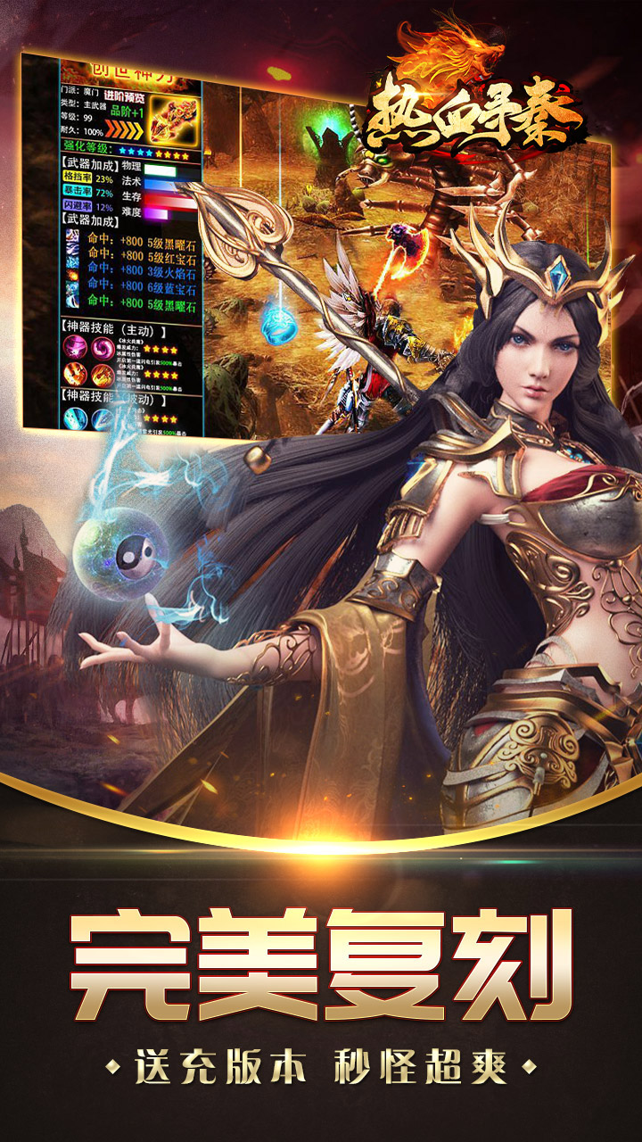 一款经典复古传奇手游,散人追梦,超多装备!上线赠送自动拾取、自动回收、灵器四件套,开天斩,逐日剑法,对怪绿毒,一百真充兑换!!超值装备!上百张地图精彩纷呈,等你来战!游戏中还有热血沙巴克活动,集齐你的兄弟一起血战!超多奖励等你拿!