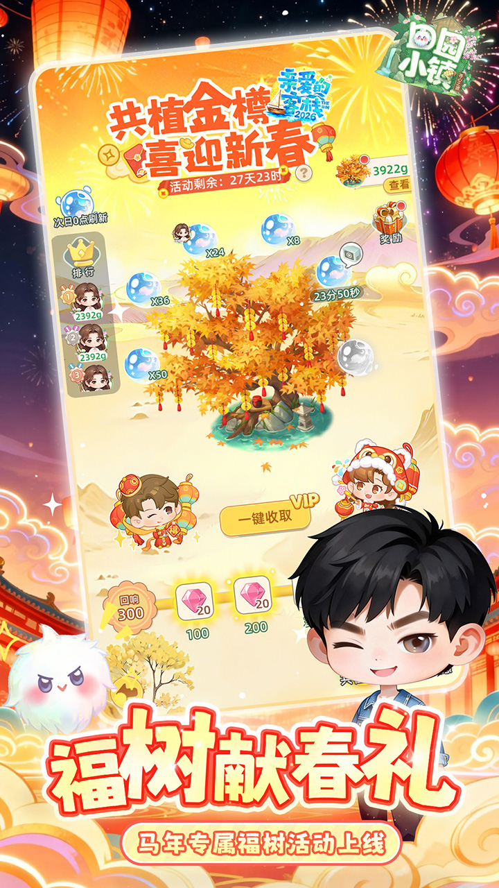新年限定玩法上线【集五福 领大礼】:每日完成任务集福卡,兑换春节限定道具与客栈周边,福气满盈过新年;集齐五福可获得现实大礼,小镇农产品,给你送家里~【合作种树】:邀请好友同心协作浇水,培育专属新年果树,收获丰厚奖励;【华彩年韵】:全新劳动手册vs城建大赛,完成经营挑战,解锁春节主题建筑与限定装扮。核心体验升级延续清新治愈画风与 “种植 - 加工 - 贸易” 完整产业链,竖屏单手操作适配多场景,通勤、午休轻松经营。这个新年,在田园小镇与《亲爱的客栈》一起,建小院、集福气、种新树,开启热闹又治愈的小镇新春!
