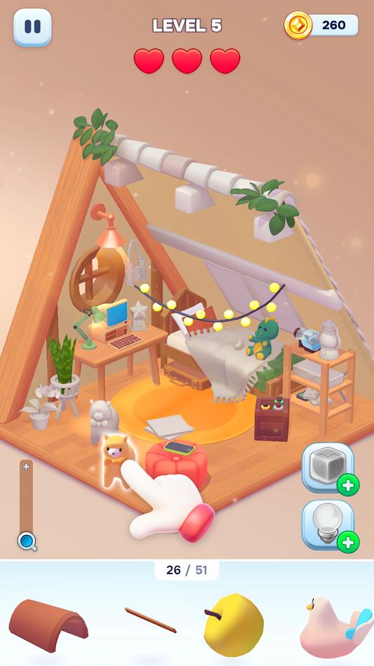 🧠 秘密脑力训练:没错,在放置物品的过程中,你不仅可以放慢节奏,享受片刻宁静,还能让你的大脑得到锻炼。玩得越多,你就越能更好地发现物体,识别图案中的形状,这些技能在现实生活中也非常实用。无论你是快速游戏还是慢节奏游戏,是偶尔玩一关还是一次玩好几关,你都能从游戏中获益良多。