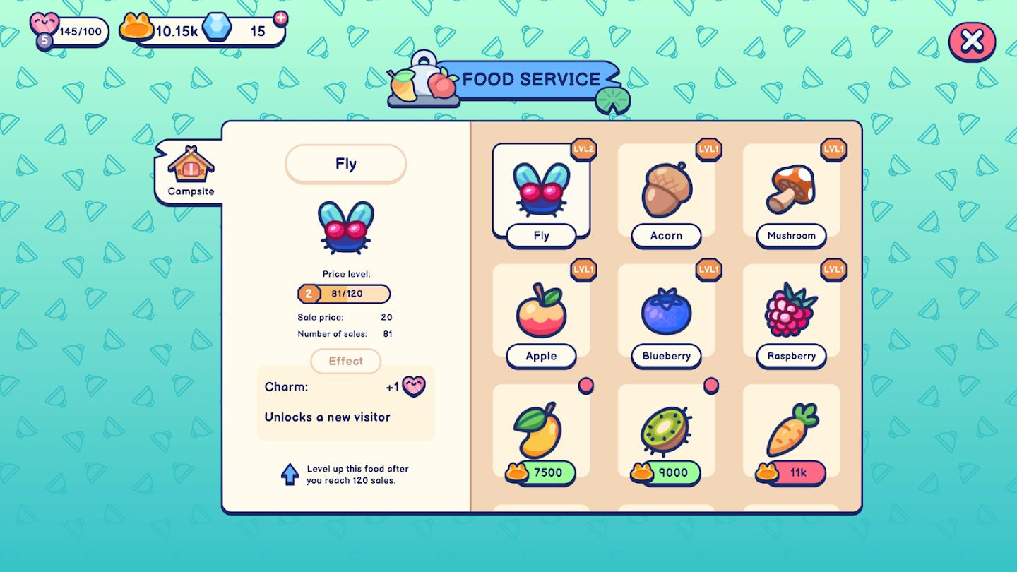 你需要在一个宁静的池塘里建造并定制一个豪华露营地,吸引青蛙和其他性格各异的访客。每位访客都有自己的喜好,有的喜欢钓鱼,有的喜欢日光浴或喝蘑菇汁。