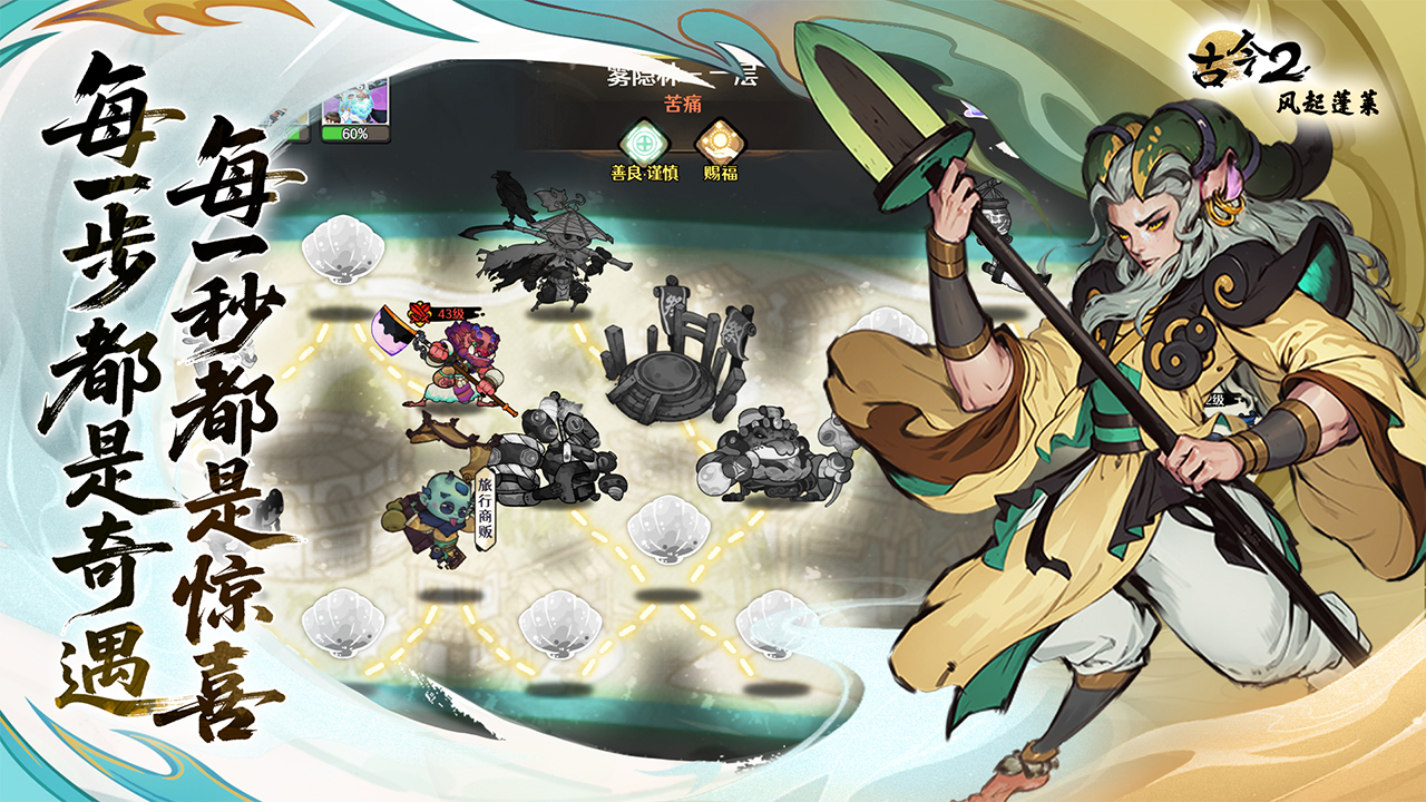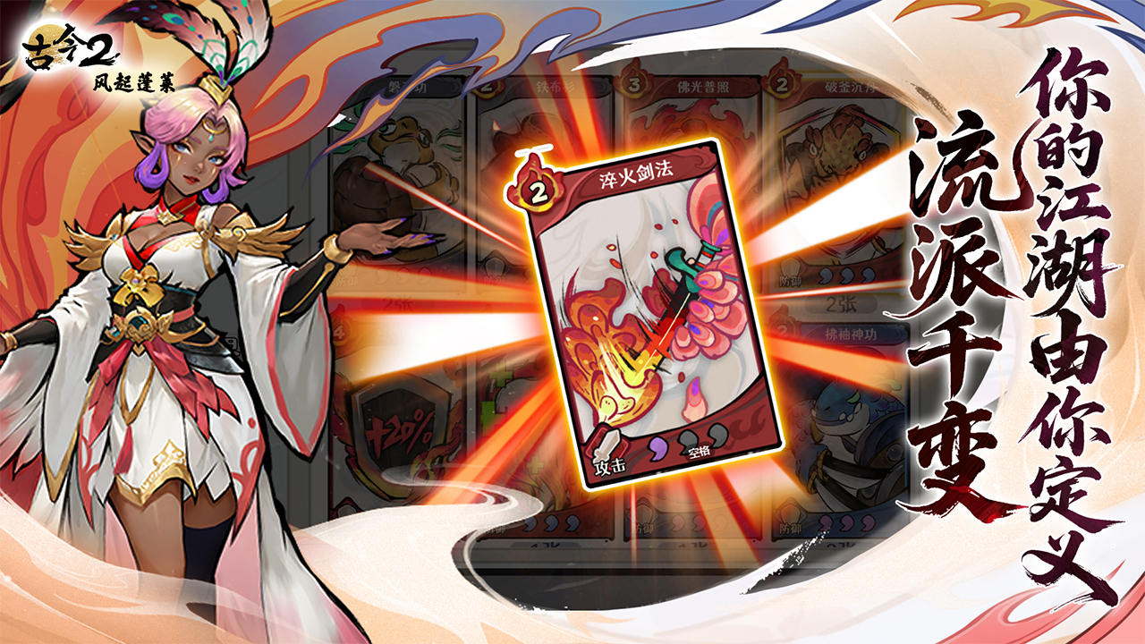 《古今2-风起蓬莱》是一款融合了“roguelike随机性、DBG卡组构筑和东方武侠画风”的卡牌策略手游。玩家将扮演一名身世特殊的少年,游历四方,习得百种武学,收集神兵利器,结识天下侠客,并肩而行!在这里没有固定法则,唯有数百张武学卡牌,百种流派,自由构筑。