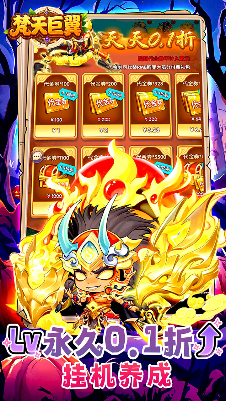 《梵天巨翼》是一款Q版国风题材的卡牌+塔防回合制游戏。你将化身主公,带领女英雄们征战天下!游戏保留了经典塔防游戏的精髓,烧脑策略秀操作,每个武将也都各具特色,趣味的玩法,休闲的画风,简单的操作,原创“满屏技能释放”,带来燃尽十足的战斗快感,每日福利拉满,永久0.1折,天天送10000代金券,让战斗在你的指尖生动重现。