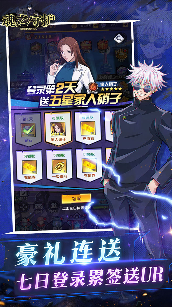 2、进游即送核心UR·五条悟·涩谷,签到再免费领五条悟和大量VIP经验