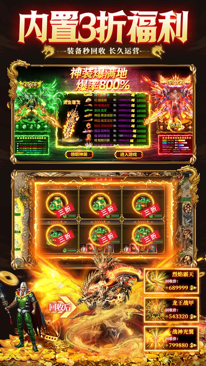 2.上线福利:创角即送”骷髅统领“时装、无限灵符、无限元宝、充值永久内置3折