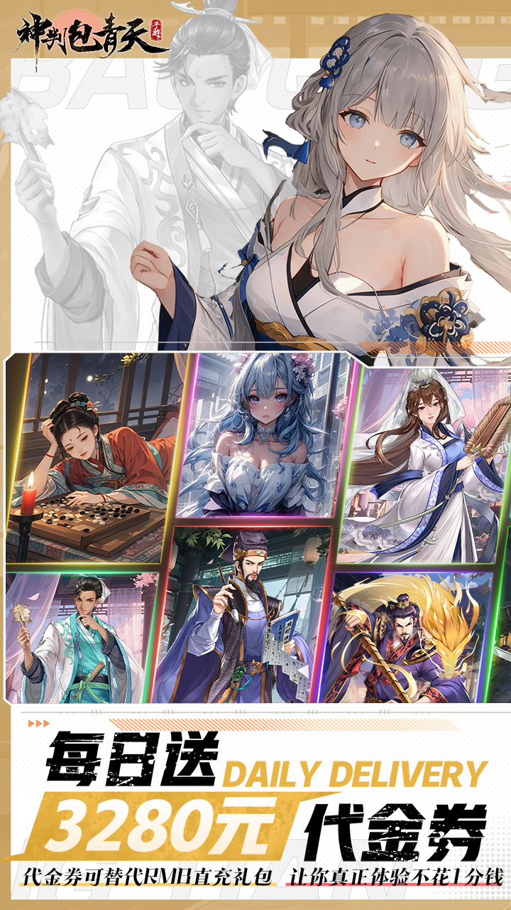 创角即送:少年包拯*3个、韩琪*1个、888元充值卡、高级装备宝箱*1、金锭礼包*20