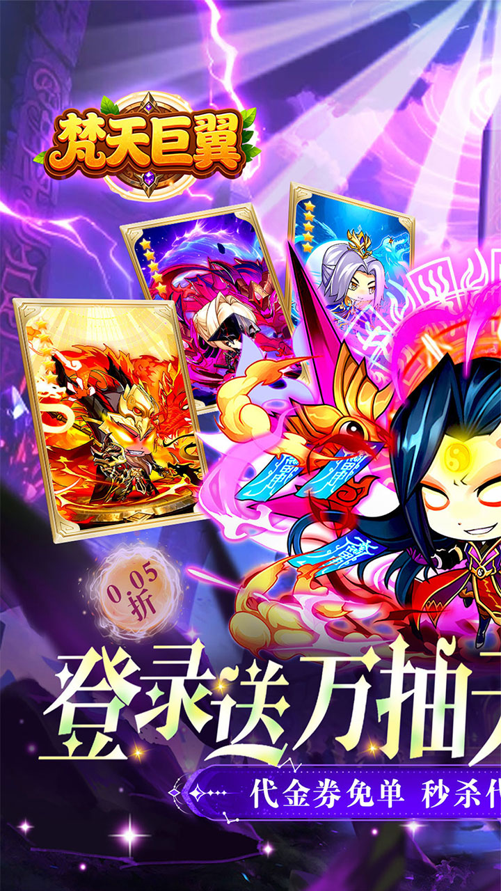 《梵天巨翼》是一款Q版国风题材的卡牌+塔防回合制游戏。你将化身主公,带领英雄们征战天下!烧脑策略秀操作,每个武将也都各具特色,趣味的玩法,休闲的画风,简单的操作,原创“满屏技能释放”,带来燃尽十足的战斗快感,每日福利拉满,永久0.05折,天天送10000代金券,让战斗在你的指尖生动重现。