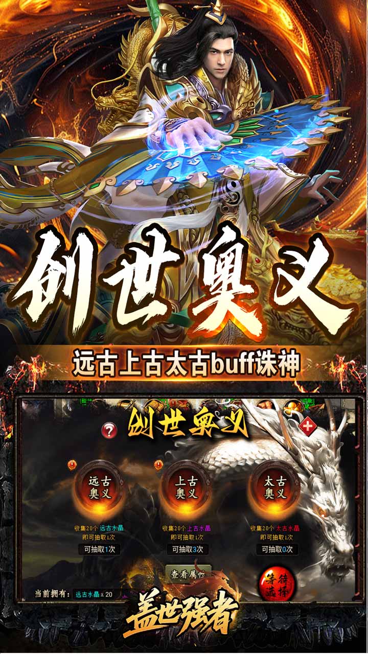 《盖世强者(太古奥义日送100)》是一款高福利单职业高爆版本。上线送自动回收、自动拾取、自动巡航、刀刀切割,[时装]·八零大叔。每日登录免费领取100代金券,玩法丰富:结合攻速专属、剧情、沉默等,装备首爆可获得代金券,福利满满。奥义系统,大陆专属剧情等特色玩法,给你不一样的体验,回归沉默打金传奇本色,一切装备货币材料靠打,时间称王!