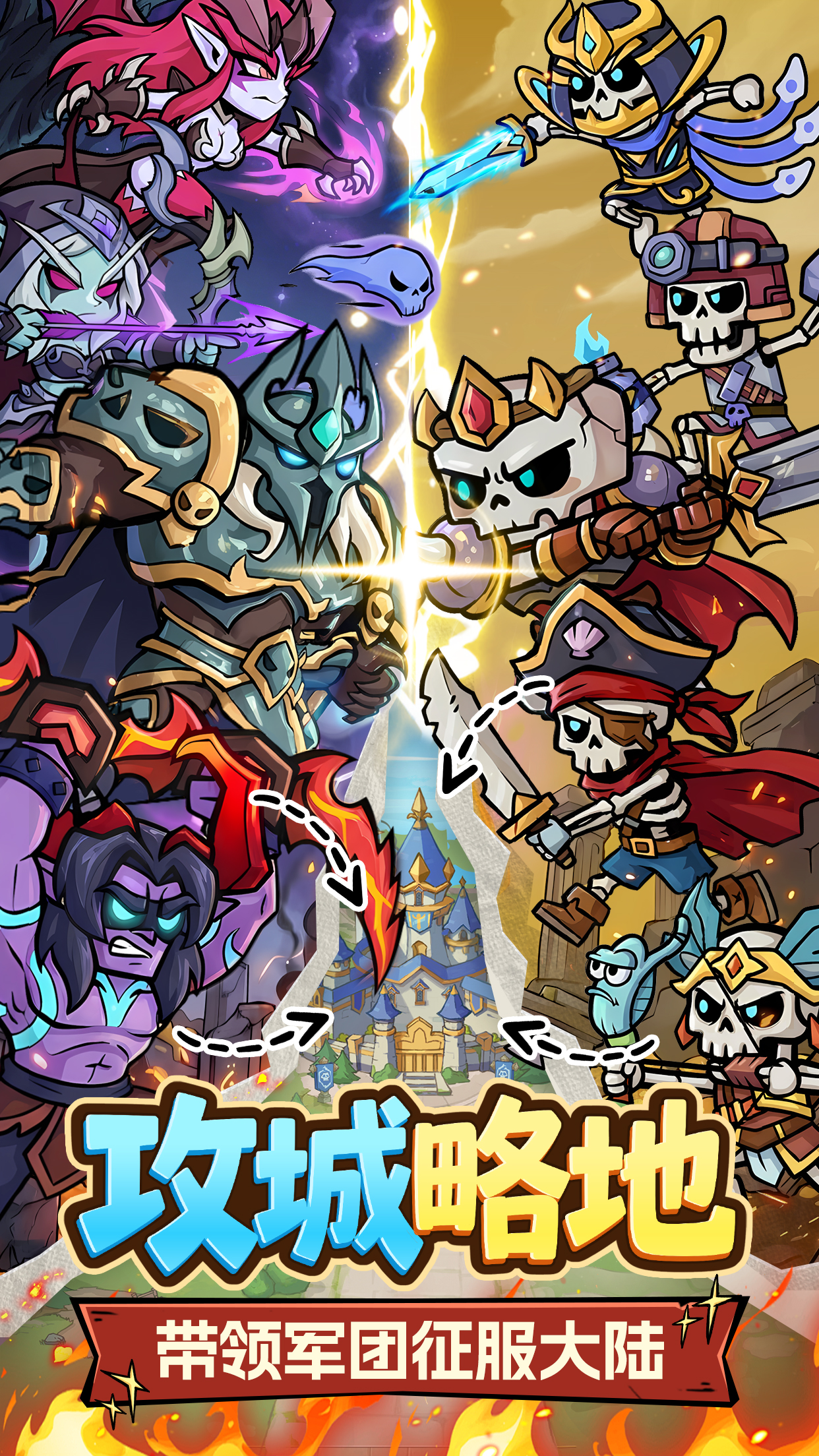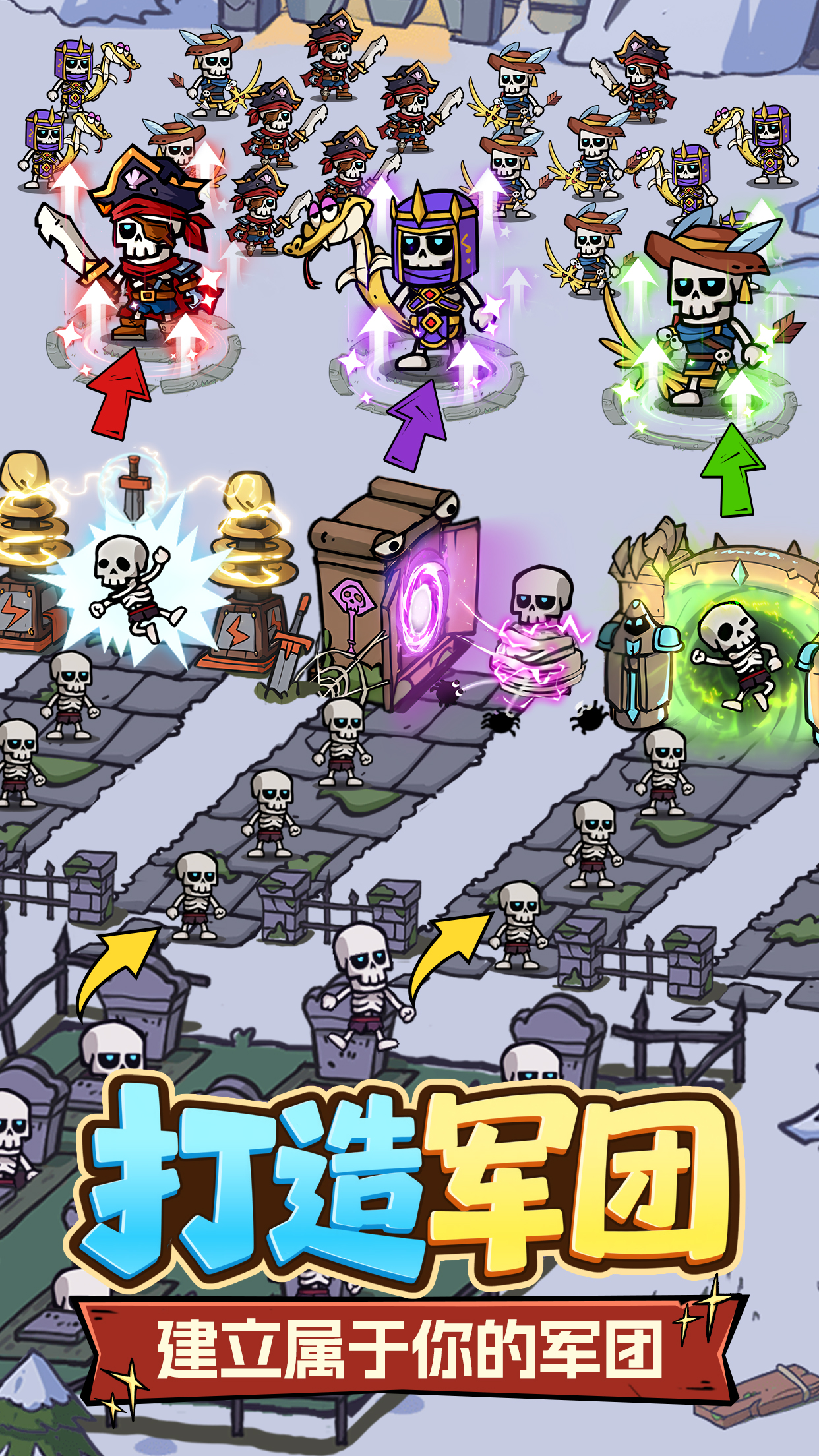 骷髅出动,通过独特的祭坛进行强化,获得不同的能力,成为新的佣兵,比如战士,弓箭手,炸弹兵,法师等多种兵种
