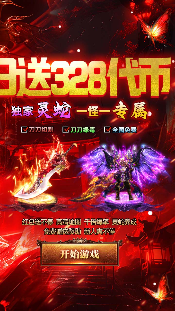 2.开局福利:开局送超级灵蛇成长神器,范围拾取、刀刀绿毒、新人称号爆率+30%,切割+8888、打野神剑