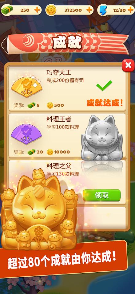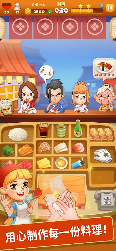 菜式丰富,操作上瘾——捏寿司、熬高汤、蒸点心……简单易上手的操作,搭配循序渐进的关卡设计,让你不知不觉沉浸烹饪乐趣!