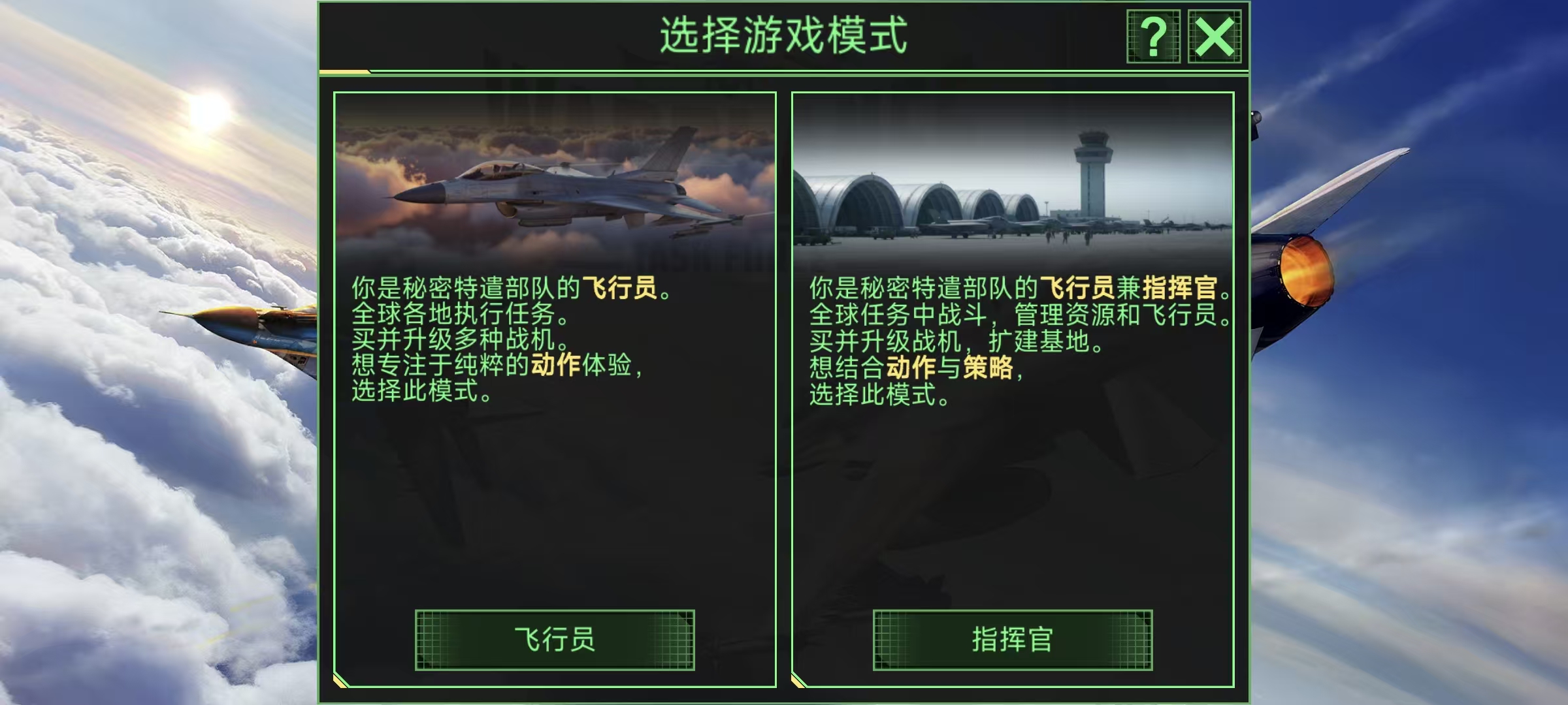 ● 飞行员模式:专注于战斗。收集、升级并指挥你最喜欢的战机,完成各种挑战性任务。