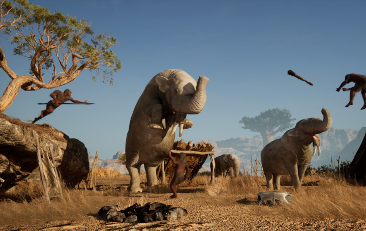 真实史前生态 + 昼夜天气循环、纯原始建造、制作体系、部落社交与多人协作生存、硬核写实的生存数值机制
