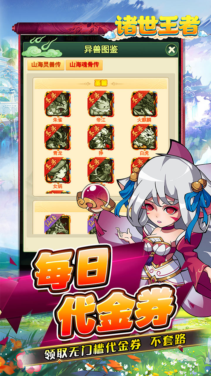 诸世王者是一款山海经题材游戏,将带你进入一个充满策略与挑战的上古世界。构建一个庞大而丰富的世界观,众多耳熟能详的神兽登场,为你带来全新的游戏体验。在这里,你不仅要收集、培养各种强大的神兽,还要合理搭配阵容,制定出最适合的战斗策略。每个神兽都拥有独特的技能和属性,如何发挥他们的最大优势,是你在游戏中需要不断思考和探索的问题。游戏中还有丰富的副本、竞技场等玩法,考验你的策略和实力。快运用你的智慧,组建属于自己的最强战队!
